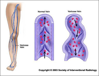 The incompetence of these valves is the basic pathology of varicose veins. The blood pressure in the section of the vein below the incompetent valve increases causing additional valves to fail. This is called ' Venous Hypertension’. When veins become varicose, the leaflets of the valves no longer meet properly, and the valves don't work. This allows blood to flow backwards and they enlarge even more. This allows blood to pool and stretch the vein segments further weakening the walls of the veins. The walls of the affected veins lose their elasticity in response to increased blood pressure. As the vein walls weaken, more and more valves are unable to close properly. The vicious cycle continues and the veins become larger and wider over time and begin to appear as lumpy, tortuous chains underneath the skin. |